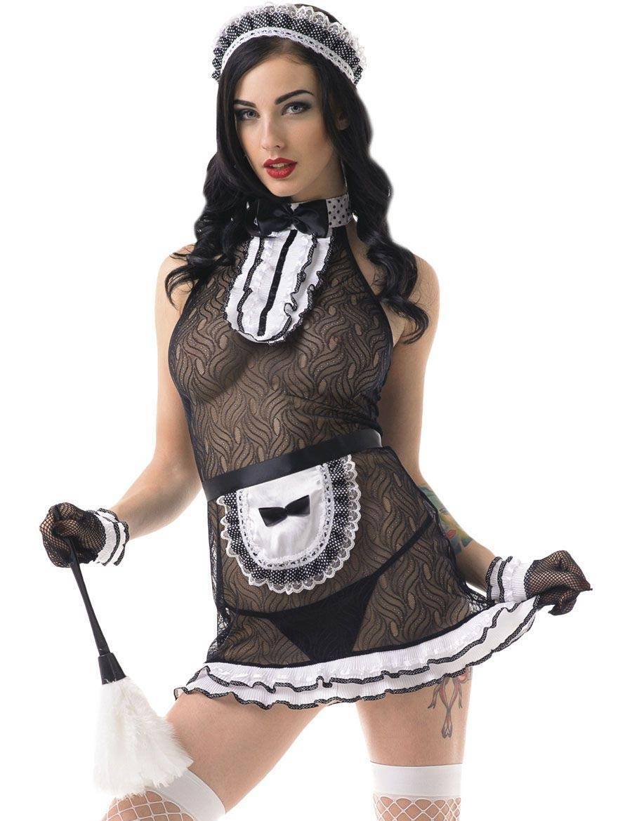 Комплект состоит из черного полупрозрачного платья с оригинальным узором и горловиной декорированной черно-белым жабо, передника, головного убора, коротких перчаток и пикантных чулок.