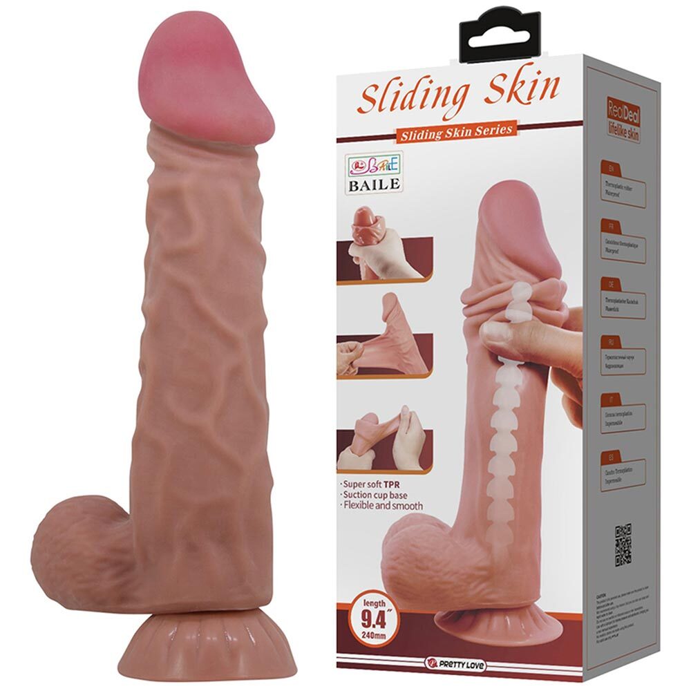 Реалистичный фаллоимитатор Sliding Skin с присоской и гибким стержнем. Длина игрушки составляет 24 см, диаметр — 5 см, а длина рабочей части — 18 см. Изготовлен из материала TPR с рельефным стволом для создания натуральных ощущений. Благодаря скользящей поверхности и внутреннему позвоночнику, игрушка адаптируется к температуре кожи, обеспечивая максимальный комфорт. Прочная присоска на основании позволяет надёжно фиксировать фаллоимитатор на любой гладкой поверхности, освобождая руки для других удовольствий. Весит 389 грамм.