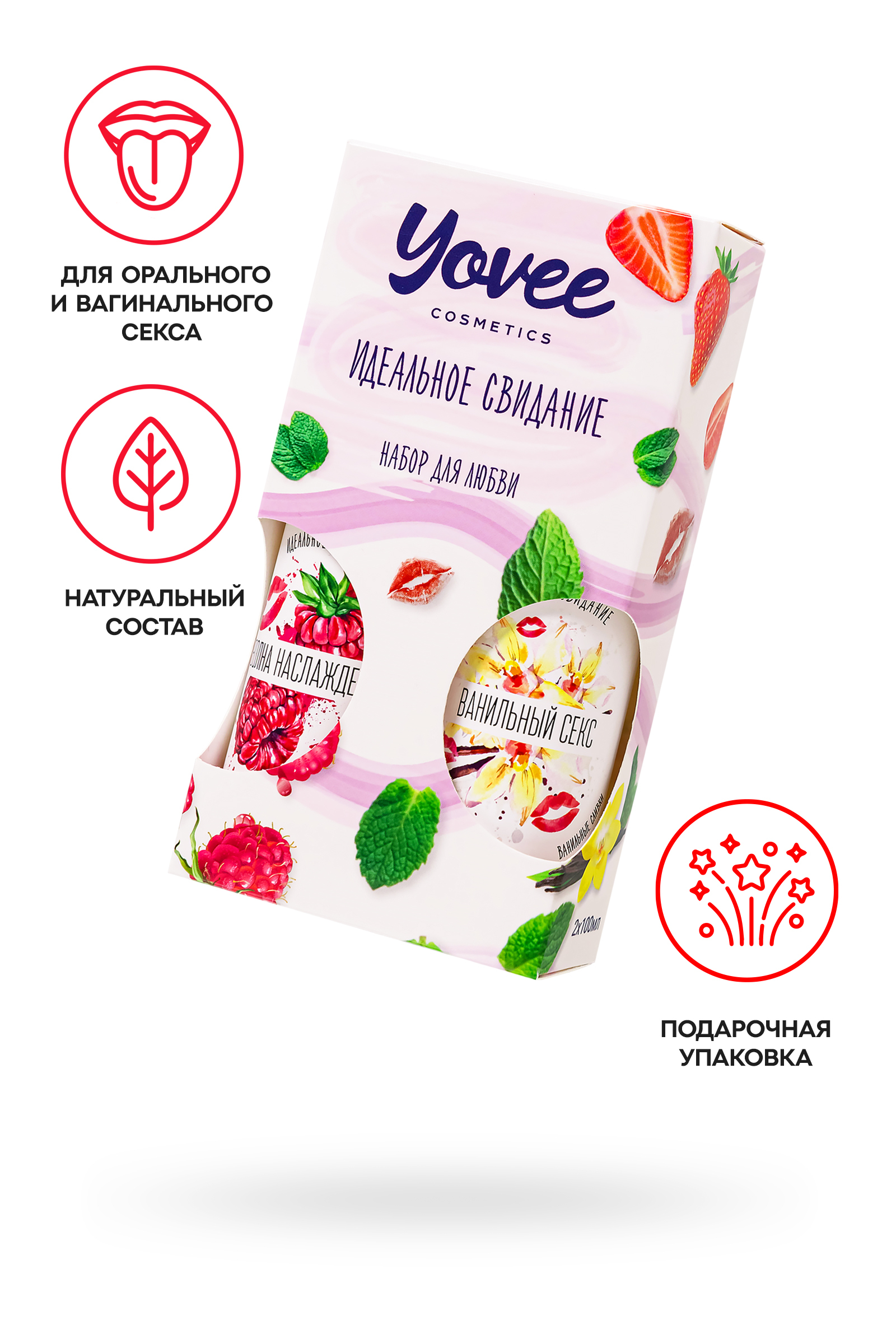 "Набор для любви" от бренда Yovee идеально подходит для эротических экспериментов.В одной упаковке два съедобных геля на водной основе. Первый обладает ярким вкусом и ароматом малины, второй - соблазнительным и нежным вкусом и ароматом ванильных сливок.Используйте самостоятельно или создайте свой вкус!Несмотря на сладость, гели не содержат сахара в составе, не нарушают микрофлору и pH-баланс.Подходят как для вагинального, так и для орального секса. Совместимы со всеми видами презервативов и игрушек для взрослых.ИДЕАЛЬНЫЙ ПОДАРОКВОЗМОЖНОСТЬ СОЗДАТЬ СВОЙ ВКУСВсе гели Yovee имеют простой и безопасный состав: вода; гидроксиэтилцеллюлоза - стабилизатор эмульсий, регулятор вязкости; Д-пантенол защищает слизистые, запускает процесс регенерации тканей; сорбат калия и бензоат натрия – безопасные пищевые консерванты, разрешенные в натуральной и органической косметике; лимонная кислота помогает поддерживать оптимальный уровень рН, является естественным консервантом.БЕЗ ГЛИЦЕРИНАБЕЗ ПАРАБЕНОВБЕЗ КРАСИТЕЛЕЙКомплектация: 721001 Съедобная гель-смазка Yovee «Волна наслаждения» с Д-Пантенолом, со вкусом малины, 100 мл 721011 Съедобная гель-смазка Yovee «Ванильный секс» с Д-пантенолом, со вкусом ванильных сливок, 100 мл