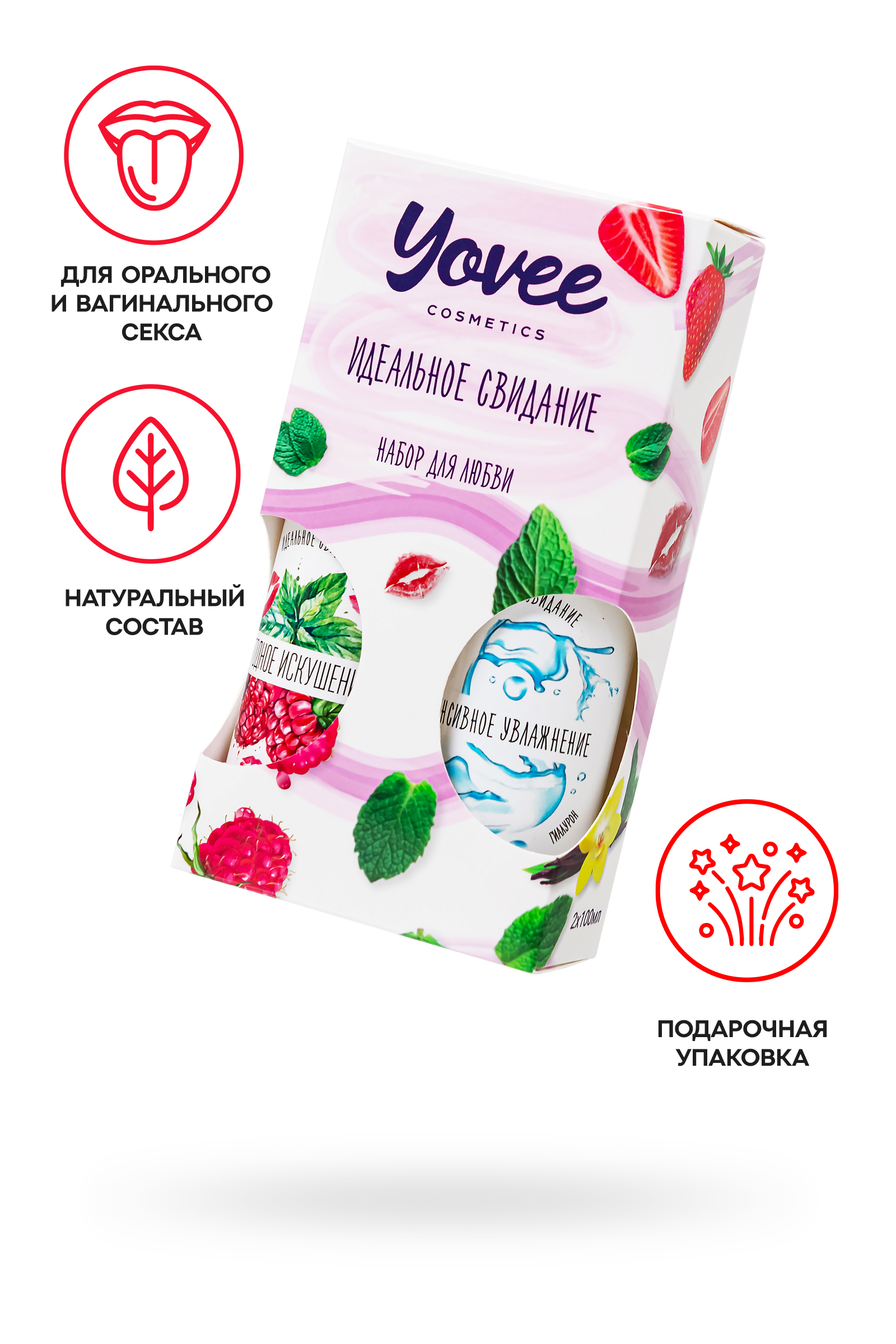 "Набор для любви" от бренда Yovee идеально подходит для эротических экспериментов.Входящий в набор съедобный интимный гель с соблазнительным мятно-малиновым вкусом и ароматом придаст оральному сексу еще больше пикантности и удовольствия, а увлажняющий интимный гель-смазка с гиалуроном обеспечит долгое скольжение, увлажнение и смягчение слизистой при вагинальном сексе.Используйте самостоятельно или смешайте гели, чтобы сделать вкус десерта менее сладким!Оба геля подходят как для вагинального, так и для орального секса. Совместимы со всеми видами презервативов и игрушек для взрослых.ИДЕАЛЬНЫЙ ПОДАРОКВОЗМОЖНОСТЬ СОЗДАТЬ СВОЙ ВКУСВсе гели Yovee имеют простой и безопасный состав: вода; гидроксиэтилцеллюлоза - стабилизатор эмульсий, регулятор вязкости; Д-пантенол защищает слизистые, запускает процесс регенерации тканей; сорбат калия и бензоат натрия – безопасные пищевые консерванты, разрешенные в натуральной и органической косметике; лимонная кислота помогает поддерживать оптимальный уровень рН, является естественным консервантом.БЕЗ ГЛИЦЕРИНАБЕЗ ПАРАБЕНОВБЕЗ КРАСИТЕЛЕЙКомплектация:721009 Съедобная гель-смазка Yovee «Ягодное искушение» с Д-Пантенолом, со вкусом малины и мяты, 100 мл721051 Увлажняющая гель-смазка Yovee «Интенсивное увлажнение» с Д-Пантенолом и гиалуроновой кислотой, 100 мл