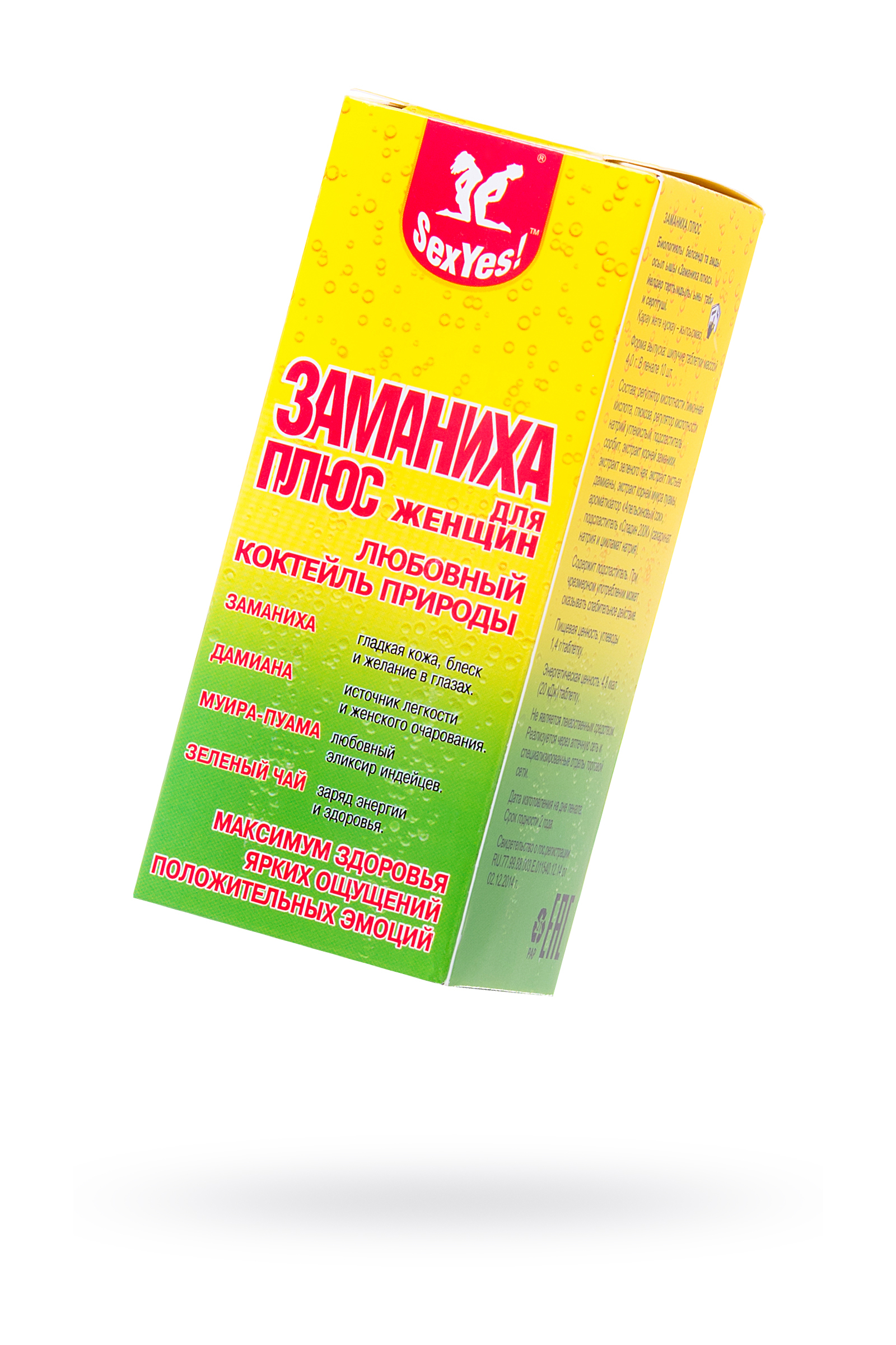 Растворимые таблетки для приготовления безалкогольного напитка. Включает экстракты заманихи, дамианы и муиропуамы. Усиливает чувственность и половое влечение у женщин, улучшает общее самочувствие и способствует внешней привлекательности.«Заманиха плюс» рекомендуется в качестве биологически активной добавки к пище – источника арбутина, бета-ситостерина, катехинов, танинов, кофеина. «Заманиха плюс» – нелекарственный препарат, обладающий превосходным тонизирующим, стимулирующим и гармонизирующим эффектами, источник максимум здоровья, ярких ощущений и положительных эмоций, природный стимулятор женской привлекательности и сексуальности. «Заманиха плюс» – любовный коктейль природы, сладкая на вкус шипучая таблетка для приготовления безалкогольного приятного любовного напитка. Быстрая и прекрасная растворимость формулы обеспечивает быстроту воздействия и повышает его эффективность.