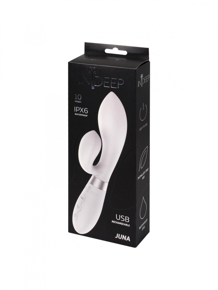 Вибромассажер Juna изготовлен из безопасного медицинского силикона, имеет 10 режимов вибрации и два моторчика, один из которых расположен в рабочей части изогнутого кончика и обеспечивает эффективную и удобную стимуляцию точки G, а второй - в клиторальном отростке массажера. Моторчики способны одновременно воздействовать на самые эрогенные зоны, вызывая приятные ощущения. Подходит как для соло-стимуляции, так и для разнообразия интимной жизни вместе с партнером во время прелюдии.Характеристики: материал- силикон, общая длина- 21,5 см, рабочая длина - 9,5 см, максимальный диаметр- 3,5 см, длина отростка - 6 см, максимальный диаметр отростка - 2,7 см. Водонепроницаемый (IPX6). Удобное и легкое управление, USB-перезаряжаемый.